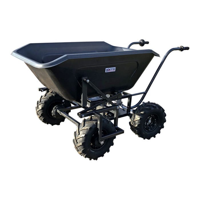 Modèle basculante à 90°, capacité 350 litres, charge utile 400 Kg, 2 moteurs 300 w, variateur de vitesse – marche avant-marche arrière-frein électronique. Grand confort d’utilisation. Compact et très maniable grâce a son faible empattement qui est très stable grâce a sa grande largeur. Ce modèle est destiné à tous type de transport volumineux. pour aliment du bétail, fourragé, bois etc. Système de biellette exclusif pour bennage à 90° automatique par gravité sans effort, verrouillage simple manuel. Deux roues arrières directionnelles de grand diamètre, technologie issus de l’automobile, composé d un essieux avec fusée et biellettes. Avec frein de parking monté sur les roues directrices. Protection peinture martelée poudre époxy-plastic cuisson au four. Particulièrement robuste avec châssis renforcée. Contrôleur d’état de charge digital.