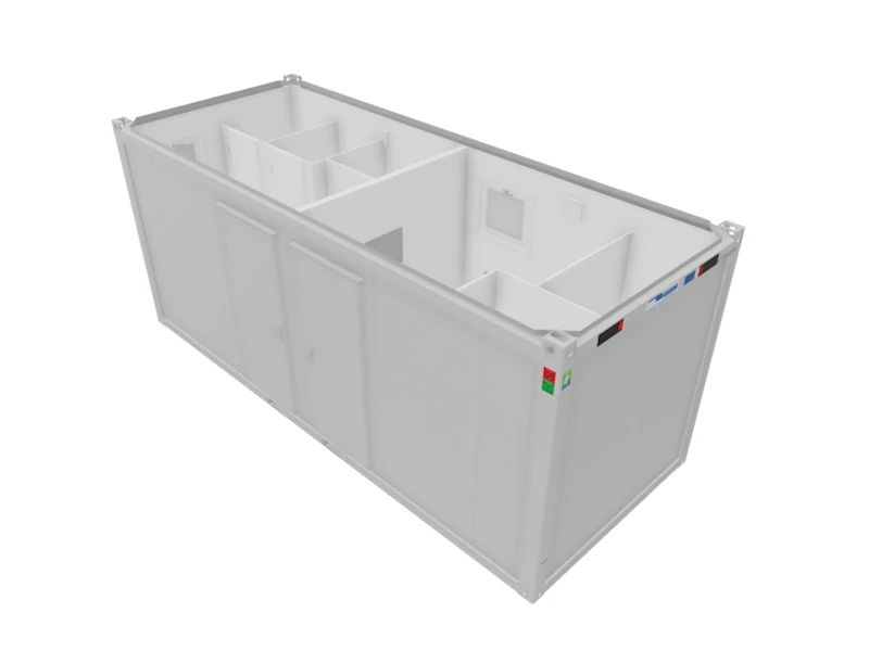 Bungalow offrant 14,7 m² (6,06 m x 2,44 m) pour 3 WC hommes et 3 WC femmes. Isolation laine de verre 60 mm murs et sol, 100 mm en toiture. 2 fenêtres vasistas. 2 portes ouvrant sur l’extérieur. 2 luminaires LED. Chauffage électrique et extracteur d’air. Décor intérieur blanc, revêtement de sol gris. Marquage CE et conformes aux normes incendie. Disponible rapidement sur dépôt. 10 500 € TTC
