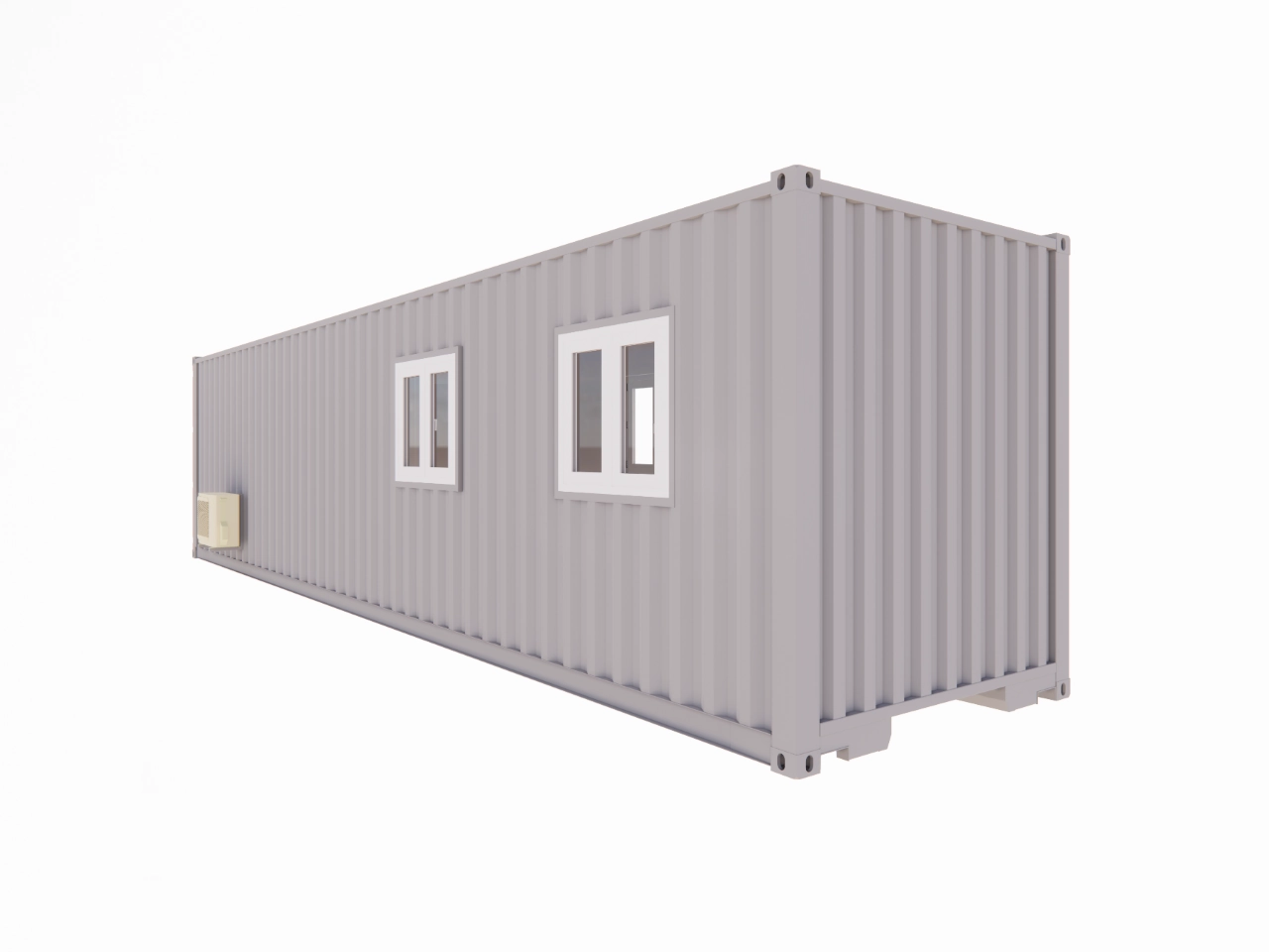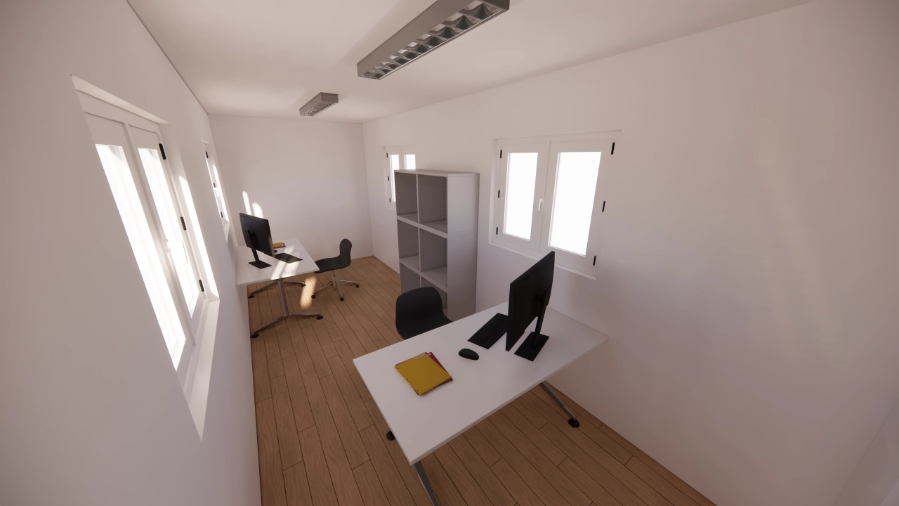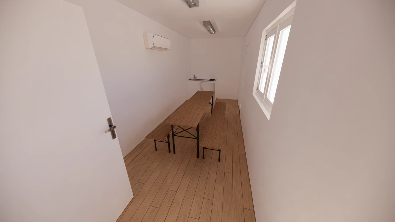 Container 40 pieds high Cube aménagé avec deux espaces : un zone bureau ou salle de réunion, et une salle de pause ou de repos équipée d’une kitchenette. Eclairage et climatisation réversible. Isolation complète. Fenêtre avec volet roulant. Accès pratique par une porte de service standard. 20 930 € TTC