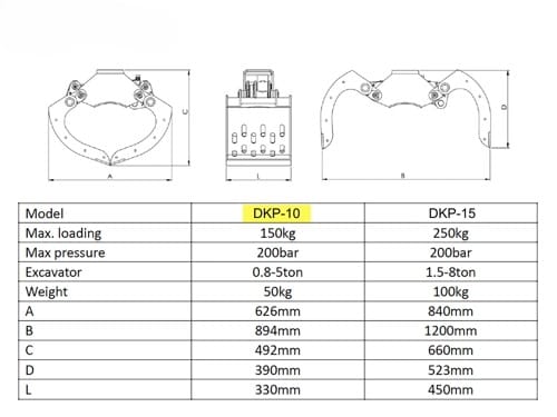 Pince de Tri, Pince de Démolition DKP-10 , Pince d’Enrochement pour mini-pelles de 0,8 à 2,5 tonnes et grues forestières, avec ouverture de 90cm et capacité de 150kg.