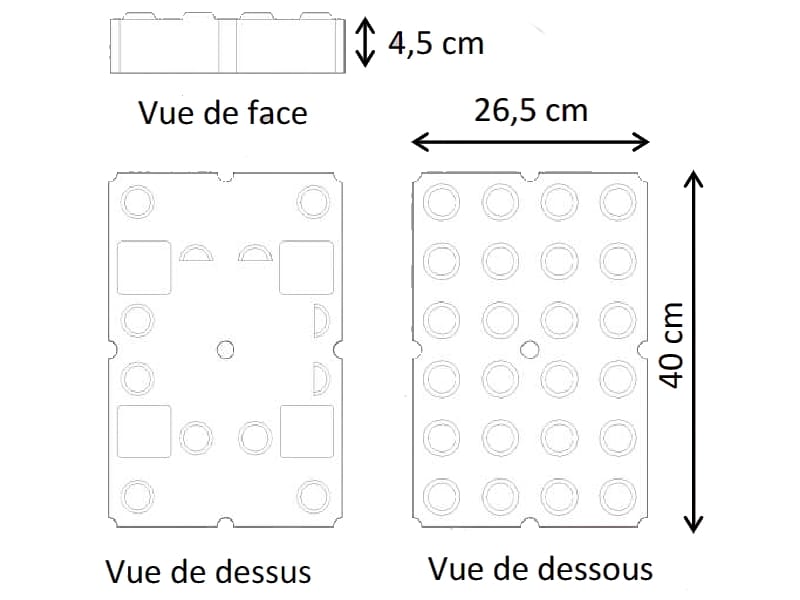 Les ergots males et femelles sur chaque faces rendent les empilements parfaitement stables (5 cales en hauteur au maximum). Possibilité d’assemblage en « camarteau » (couches entrecroisées).
